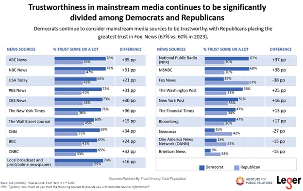Carter knows from where she reports. She cites the fifth annual Disinformation in Society Report from the Institute for Public Relations and Leger and often, institute-driven studies carry the heft of non-profit orientation behind them. Not that this translates to everyday news consumers. NPR (which is a “.org”) continues to be despised by the Right, trusted by less than one in three Republicans (30%), the study found.